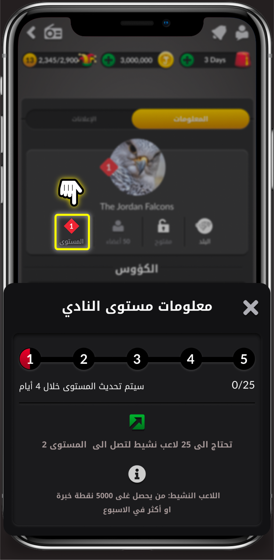 لاعبينا في النوادي، لقد قمنا بتعديل بسيط على الواجهة الرئيسية لكل نادي وهو نقل مستوى النادي وجميع المعلومات المتعلقة به إلى أيقونة المستوى الموضحة بالشكل أدناه وذلك لتصبح أكثر وضوحاً للاعبين.
