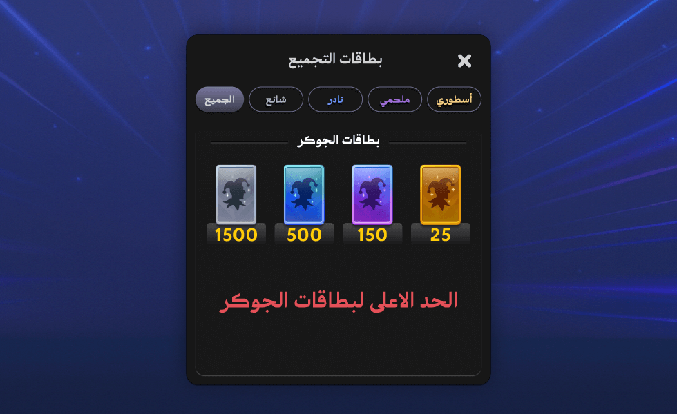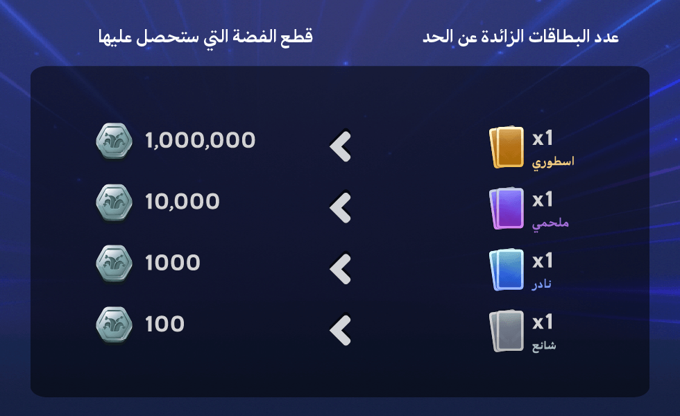 - تعويض بقطع الفضة: في حال كان لديك عدد من البطاقات تتجاوز الحد الأعلى المسموح به لبطاقات الجوكر، سيتم تحويلها إلى قطع فضة.