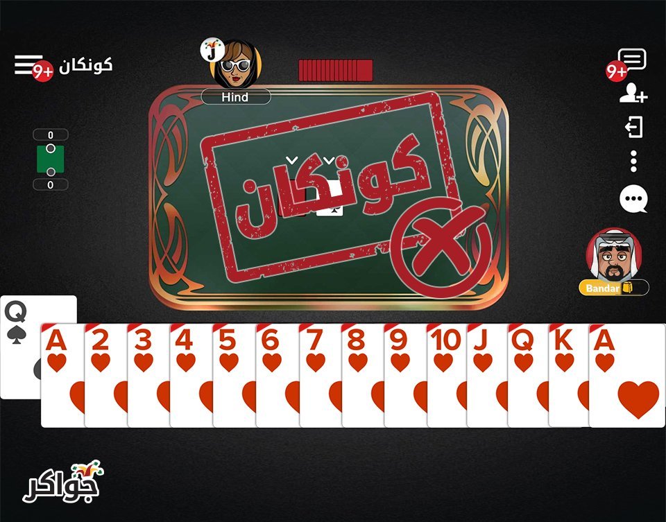 - في حال تم تجميع جميع الأوراق من نفس النوع في الوضع المتسلسل كما في الصورة أدناه فلا تظهر شارة الكونكان والسبب هو عدم تفريق العشرة أوراق عن البير الرباعي.