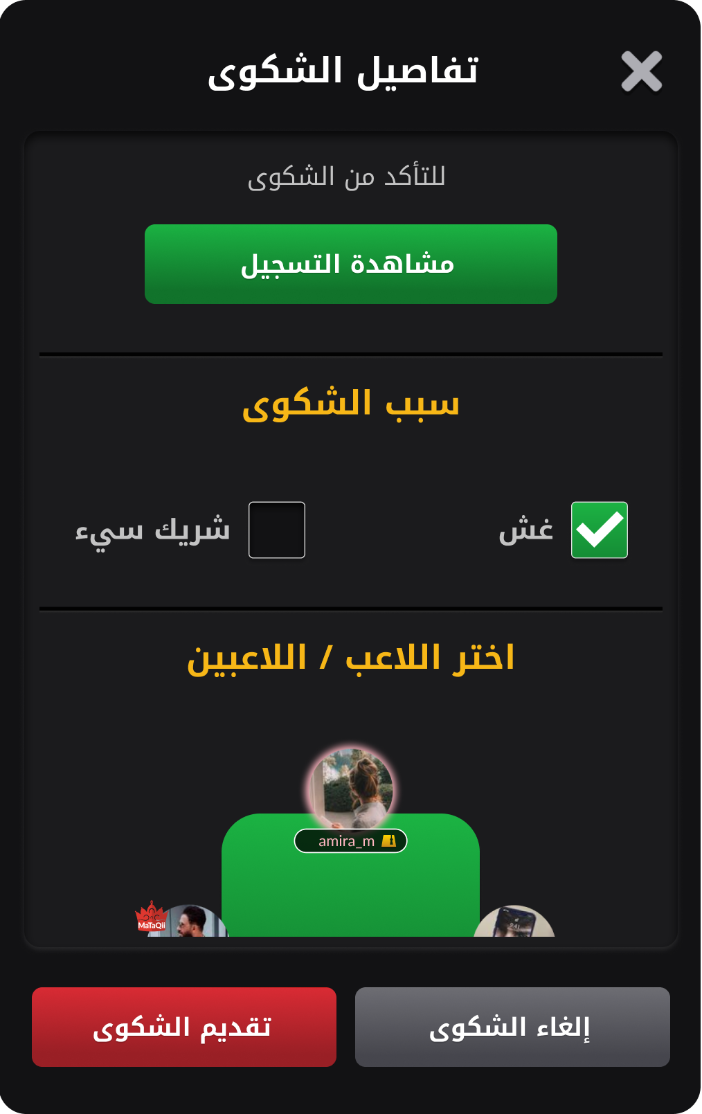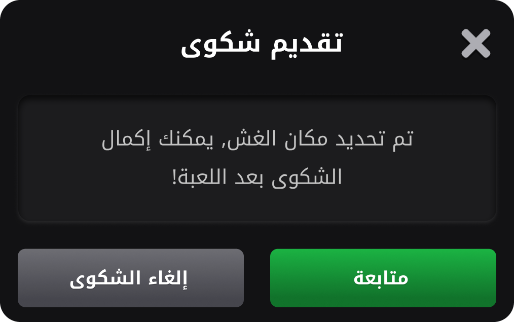 - يمكن للّاعب الانسحاب من تقديم الشكوى بعد تحديد موقع الغش عبر إلغاء صفحة التأكيد بعد انتهاء اللعبة.