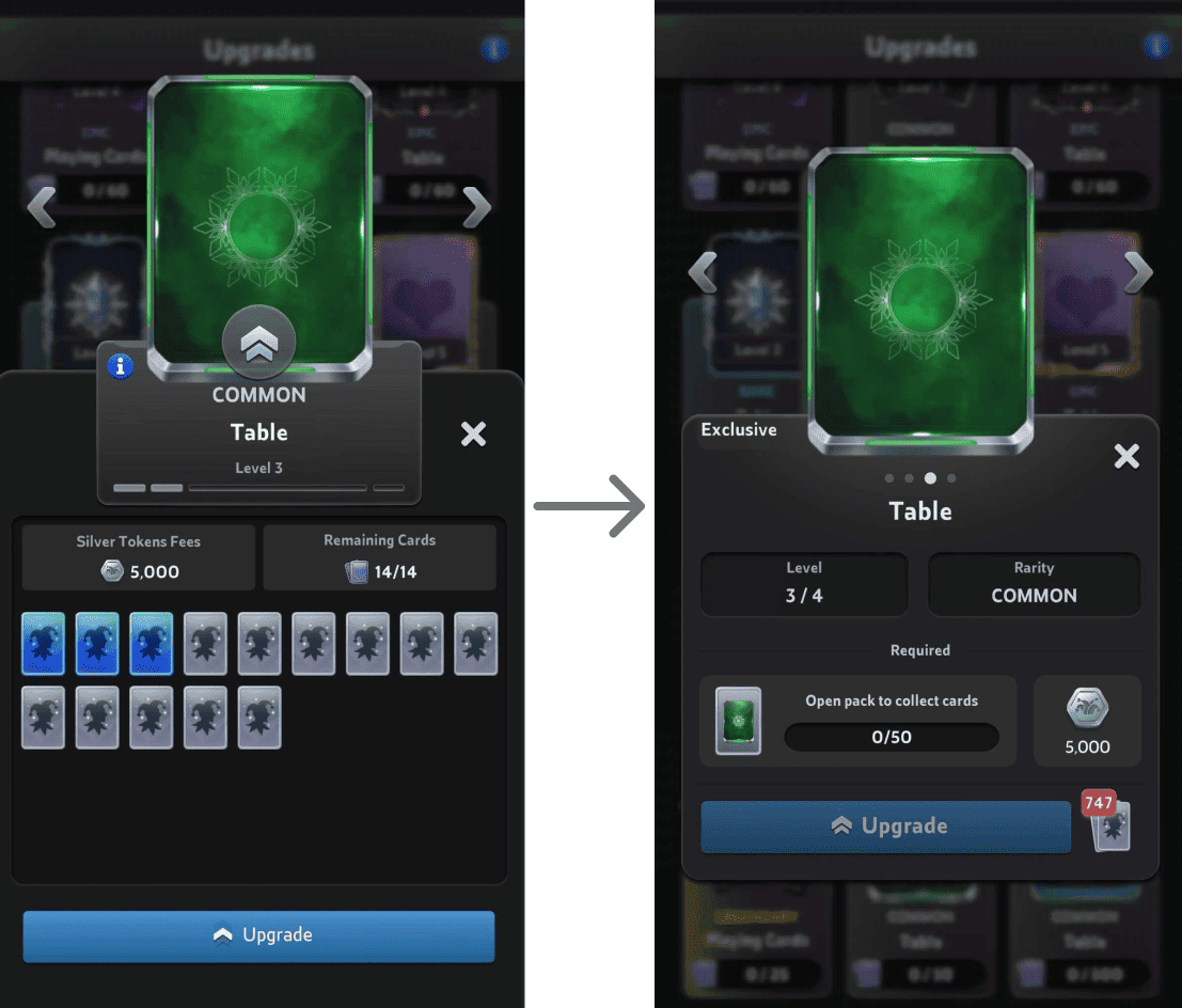 That’s why we’re making a change! From now on, past collectible items will only require one type of wildcard (of a single rarity) instead of mixing different shard rarities. Meaning: If the card-back in the example below required multiple shards of different rarities to upgrade, moving forward it will start requiring just one type!