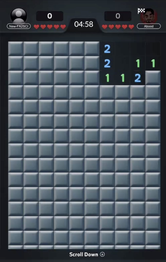 - The game starts with an area of open blocks. Both players start there, having the same grid and identical mine locations.