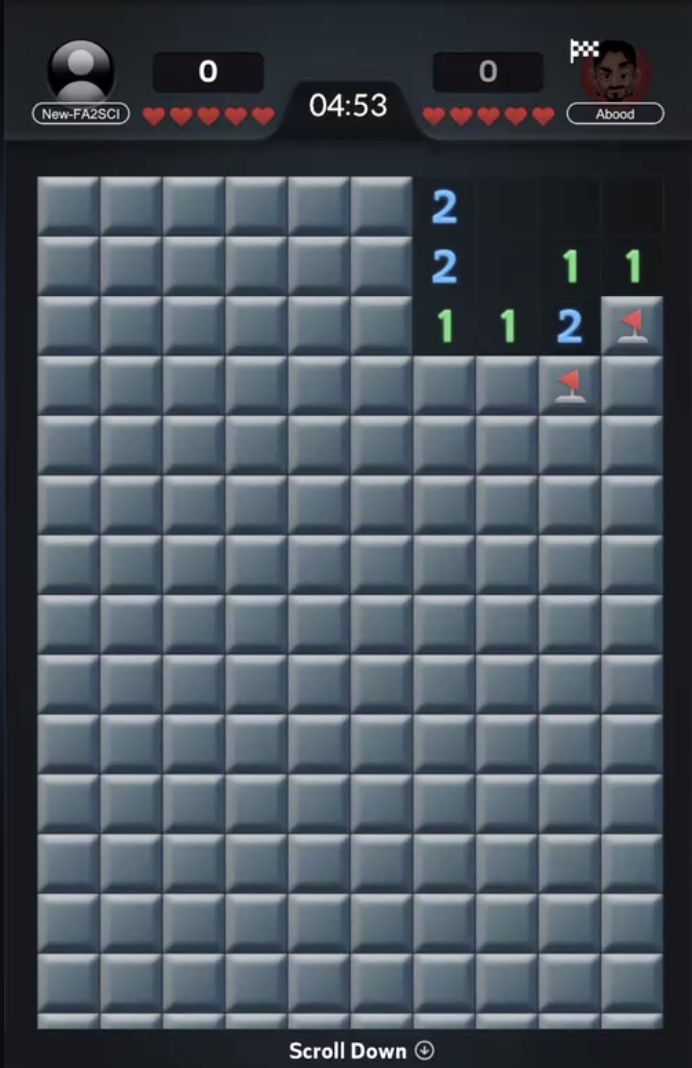 - يبدأ كل لاعب بمخزون يحتوي على 3 أرواح ويقوم كل منهما بجمع النقاط حسب عدد المربّعات التي تم كشفها وعدد الأرواح التي تم صرفها.