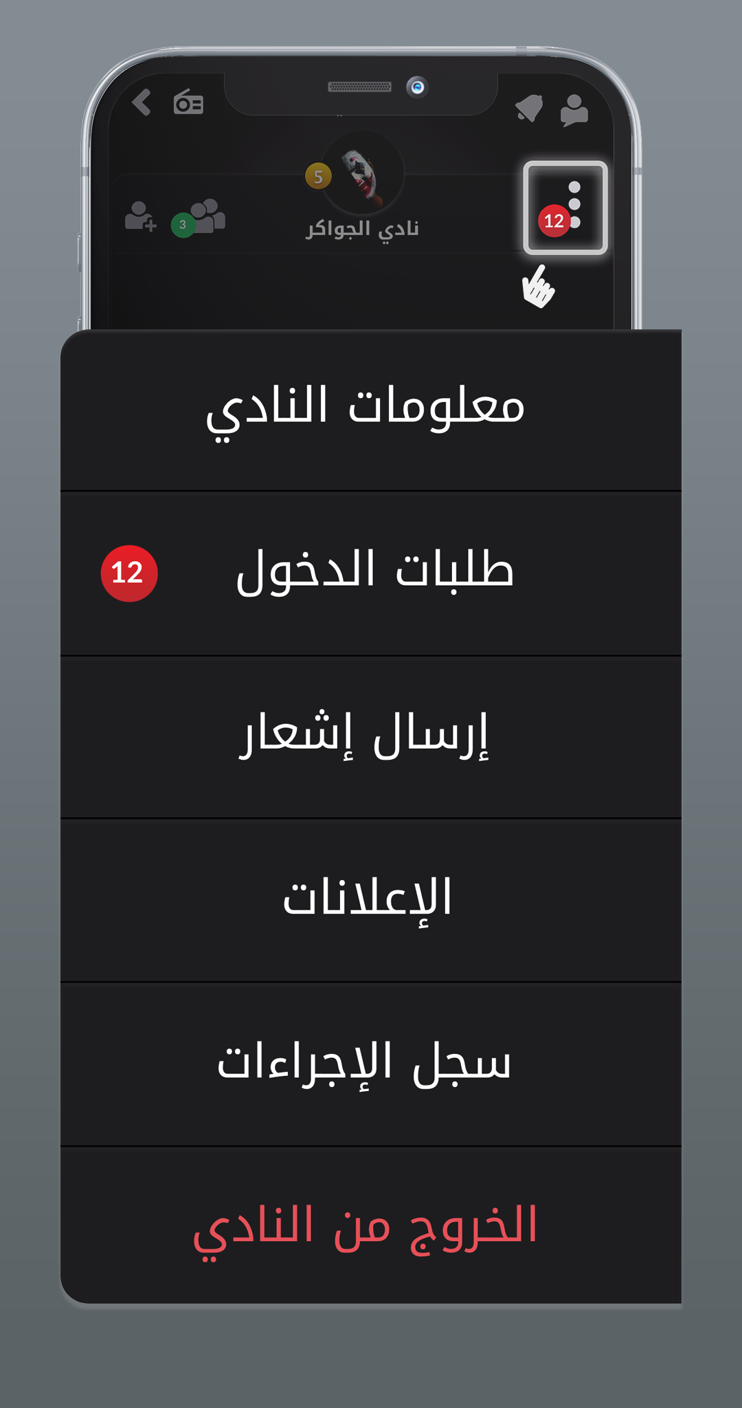 - إتاحة اعدادات النادي بطريقة يسهل على اللاعبين الوصول إليها من خلال القائمة الموضحة أدناه، حيث يمكنهم من خلالها الوصول إلى معلومات النادي، قوانين النادي بالإضافة إلى خيار الخروج من النادي. ويختلف محتوى هذه القائمة بناءاً على صلاحيات العضو داخل النادي، إذ تختلف صلاحيات العضو العادي عن صلاحيات المشرف وصاحب النادي.