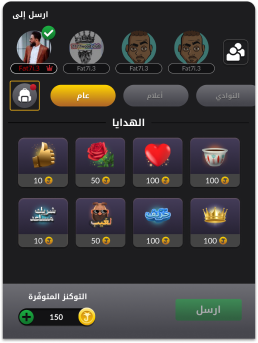 بناءً على الصورة المرفقة، يمكن للاعب العثور على الحقيبة عند الضغط على خيار “إرسال هدية”. حيث تحتوي هذه الحقيبة على مجموعة من الهدايا التي وصلت لحسابك من خلال العروض، التحديات، والإنتقال من مستوى إلى مستوى أعلى. يمكن للاعب اختيار أي من هذه الهدايا وتقديمها كهدية لأي من أصدقائه.
