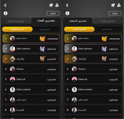 - متصدري الاهداء: هم أكثر اللاعبين إهداءً بناءً على مجموع نقاط الهدايا التي قاموا بإهدائها خلال الأسبوع.