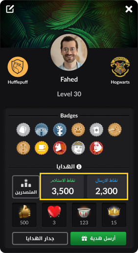 - أكثر المهدين: هي قائمة تبين أسماء اللاعبين الأكثر إهداءً لك، بناءً على مجموع نقاط الهدايا التي قاموا بإهدائها.