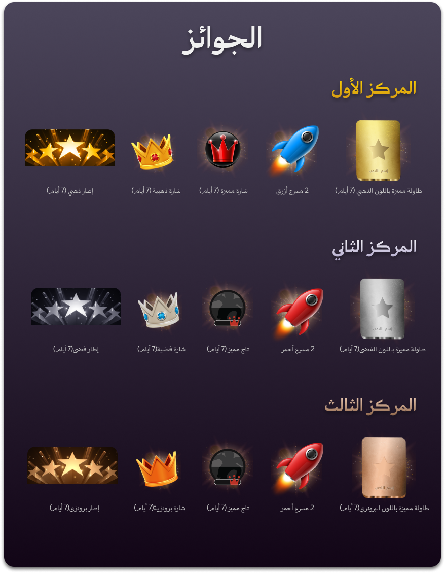 - المركز الأول: شارة مميزة ( 7 أيام) ، 2 مسرع أزرق، طاولة مميزة باللون الذهبي ( 7 أيام) ، شارة ذهبية ( 7 أيام)، إطار مميز باللون الذهبي ( 7 أيام).