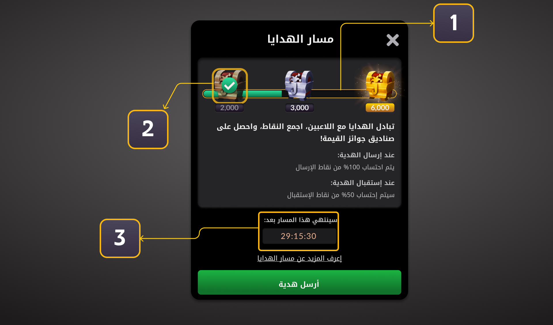 كلما جمعت المزيد من النقاط، كلما زادت فرصة فتح صناديق الجوائز . لذا ما الذي تنتظره؟ ابدأ في إرسال الهدايا اليوم واحصل على مكافآتك الرائعة!