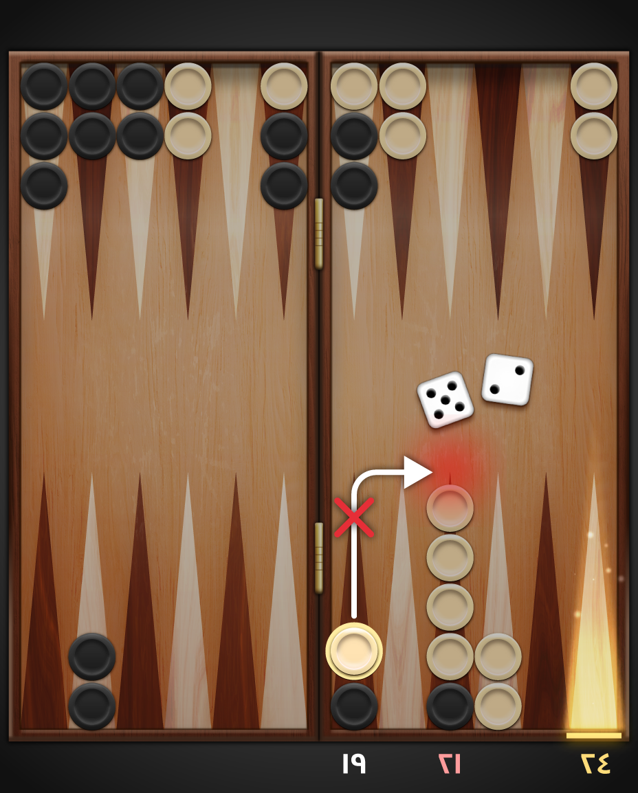 الحل الصحيح هو إجبار اللاعب على إستخدام النرد الأكبر من خلال تحريك أحجار الخانة "19" أو من خلال تحريك حجر الخانة "1" هو موضح في الشكل أدناه.